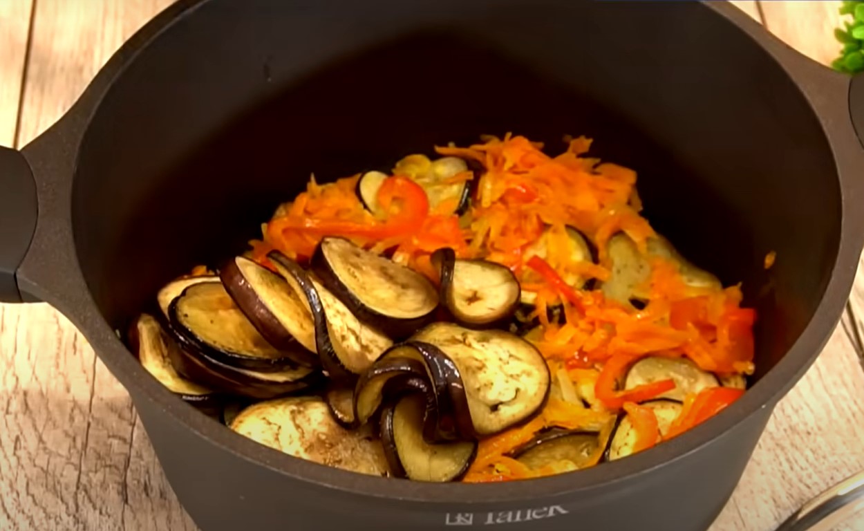 Обсмажуємо цибулю до золотистості, виймаємо зі сковороди і потім обсмажуємо моркву пару хвилин, додаємо солодкий перець, тушимо пару хвилин і додаємо тертий або пропущений через прес часник.