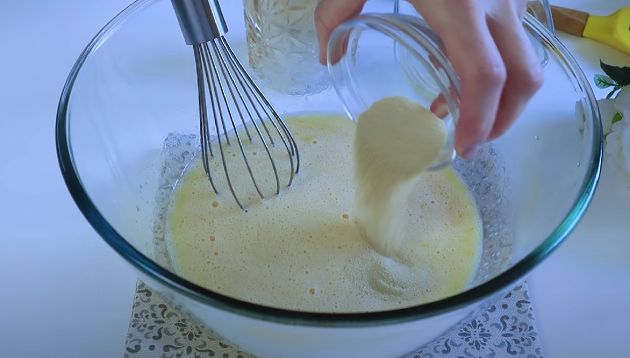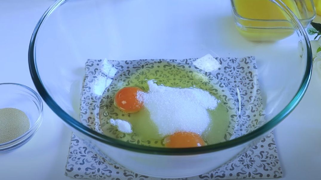 КРОК 1: Яйця (2 цілих і 1 білок) кімнатної температури розбиваємо в миску, додаємо цукор і дрібку солі. Збиваємо вінчиком до появи піни.