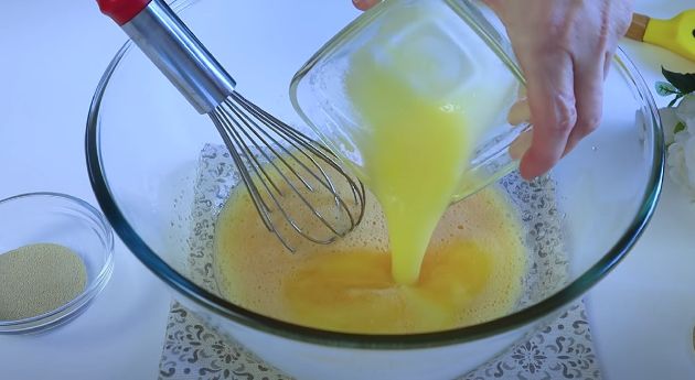 КРОК 2: Вливаємо розтоплене вершкове масло (або маргарин для випічки) і тепле молоко. Добре перемішуємо вінчиком.