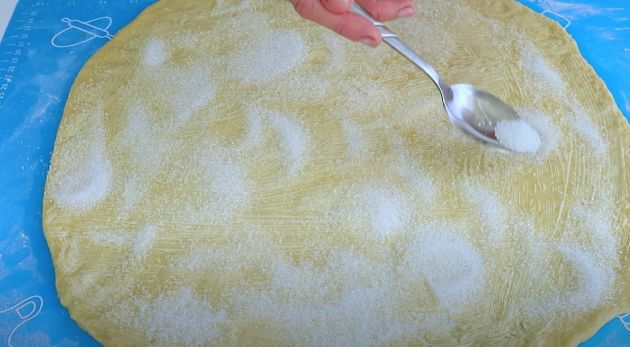 КРОК 6: Готове тісто вимішуємо на робочій поверхні протягом 5 хвилин. Розкочуємо тісто в пласт. Змащуємо м’яким вершковим маслом і присипаємо цукром.