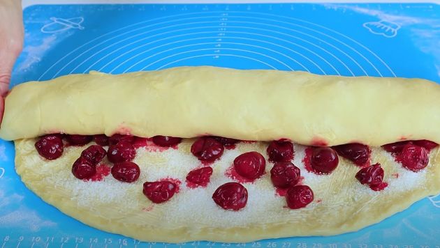 КРОК 7: Вишню (розморожену) викладаємо на тісто і звертаємо в рулет, який розрізаємо на рівні 8 – 9 частин.