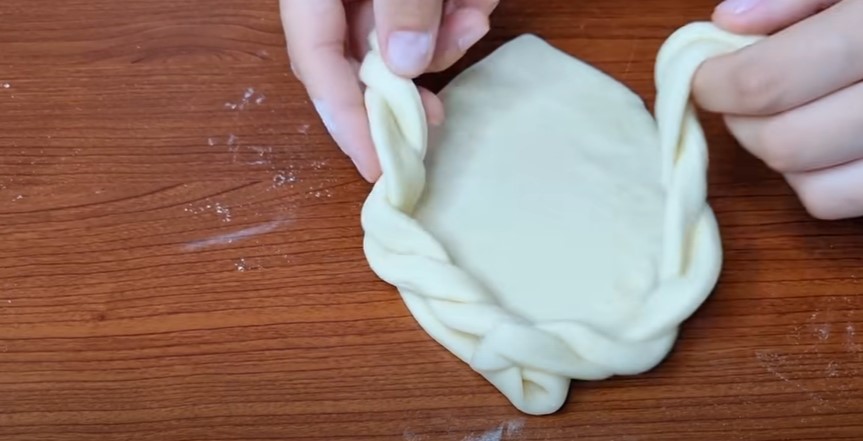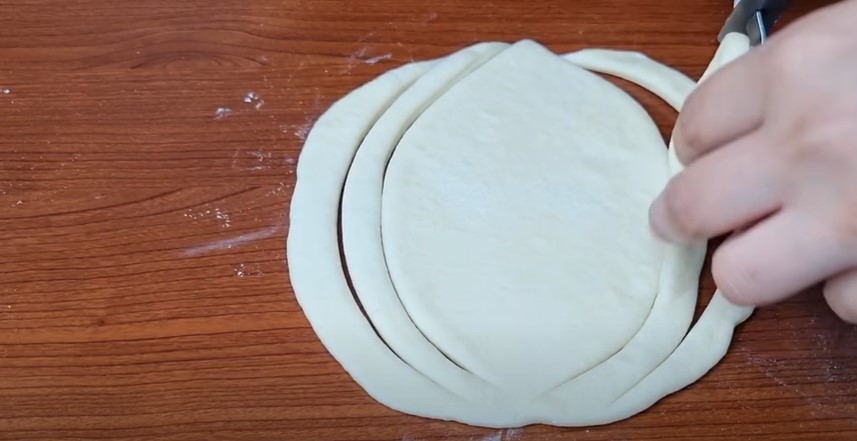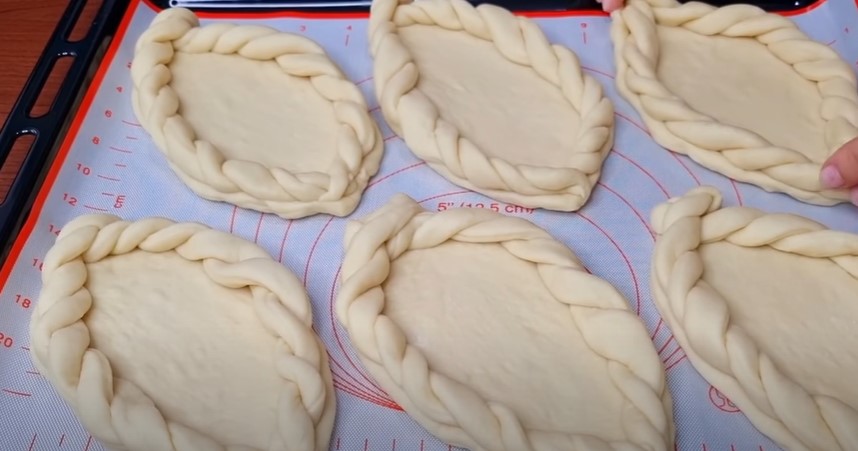Кожен колобок розкочуємо в овальний корж з товщиною близько 5 мм і защипуємо обидва краї, щоб сформувати човник.