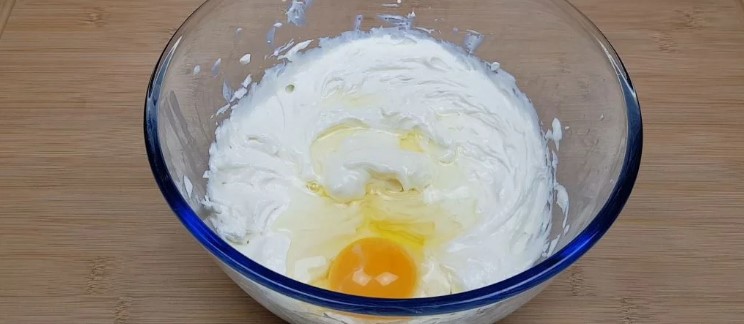 До сиру додаємо 1 яйце, перемішуємо на не великих оборотах міксера до однорідного стану, збивати не треба.