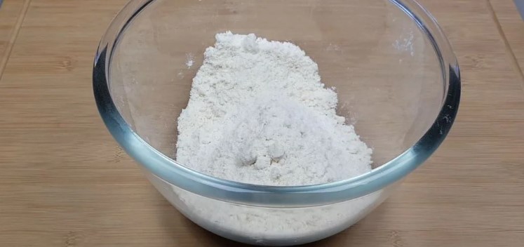 Приготуємо насипне тісто. У миску просіваємо 240 грамів або 1,5 склянки пшеничного борошна. У мене склянка об’ємом 250 мл.