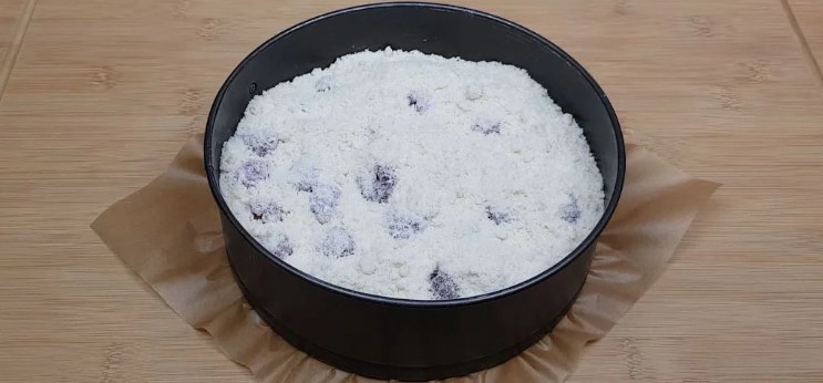Перемішуємо, кожна ягода повинна бути покрита борошном. Ягоду заздалегідь розморожувати не треба.