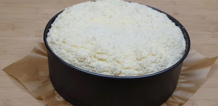Крихту покриваємо рештою сирної маси і розрівнюємо. Сирну масу посипаємо залишками крихти.