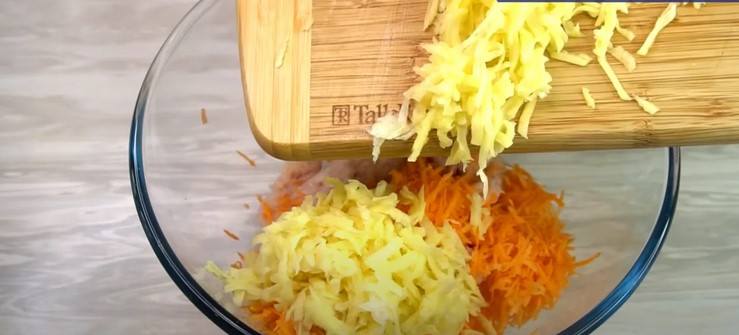 Овочі очистимо. Моркву натремо на дрібній тертці, картоплю і цибулину на грубій терці. До фаршу додаємо моркву, картоплю сіль половину ч.л., чорний перець за смаком.