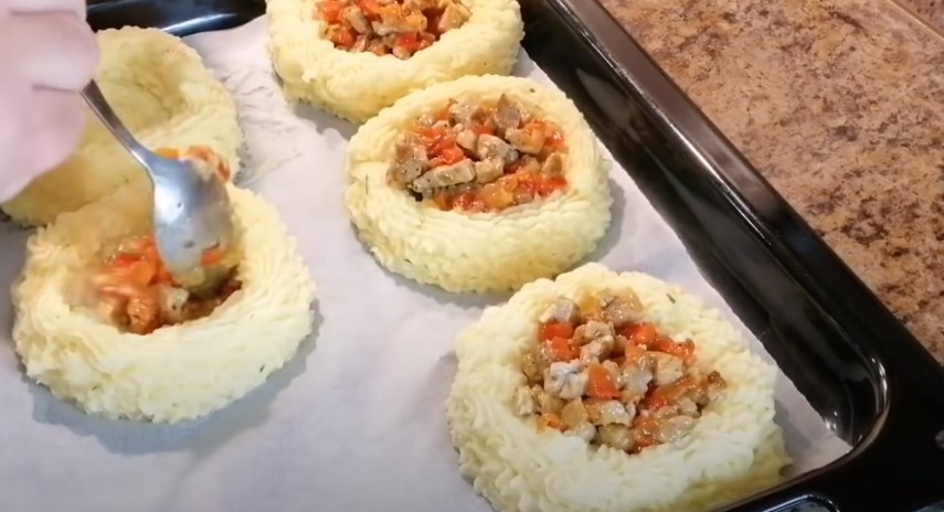 Деко застилаємо пергаментом і столовою ложкою викладаємо «гнізда» з пюре. Можна видавлювати масу пакетом з відрізаним куточком у вигляді гнізда.