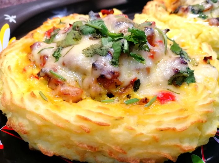 Страва насправді виходить дуже ефектною, смачною та ситною. Така гаряча закуска буде актуальною на будь-якому святковому столі. Основа страви – картопляне пюре, м’ясна начинка з солодким перцем і сирною заливкою.