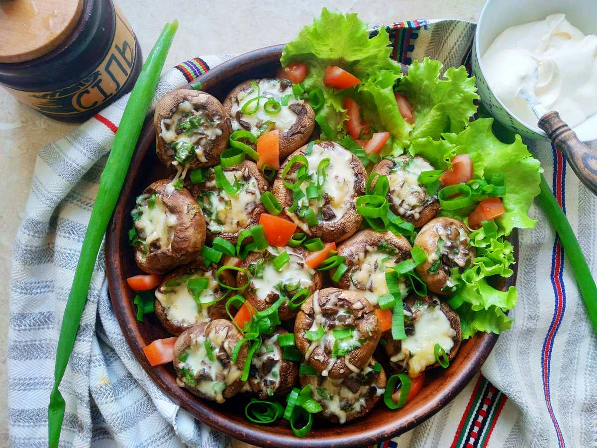 Влітку на дачі ми частенько влаштовуємо посиденькі з друзями і, звичайно, готуємо щось смачненьке на мангалі: шашлик зі свинини, курячі крильця чи рибу на грилі… (Якщо чесно, то посиденькі на дачі у нас не тільки влітку, бо ніщо так не зігріває взимку, як колективний бограч, приготований на плиті грубки 🙂 ). Одного разу хтось запропонував запекти шампіньйони з сиром на гриль-решітці. І ця швидка закуска так всім сподобалася, що на дачу без грибів ми рідко коли їздимо. Це настільки простий рецепт, що він не міг не стати улюбленим і на нашій кухні. Бо шампіньйони з сиром легко можна запекти і в звичайній духовці. В цій статті я розкажу, як можна трохи ускладнити рецепт і зробити фаршировані шампіньйони. При цьому їх начинка може бути яка завгодно!