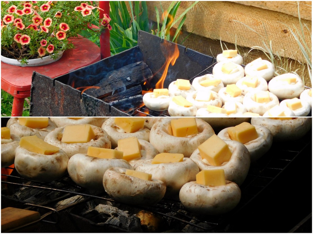 Ви вже зрозуміли, що дачний варіант цієї страви: відокремити шапочки грибів від ніжок, покласти туди нарізаний кубиками сир — і на гриль хвилин на десять. Стежте, щоб не було великого вогню, бо гриби просто згорять. Вони мають томитися.