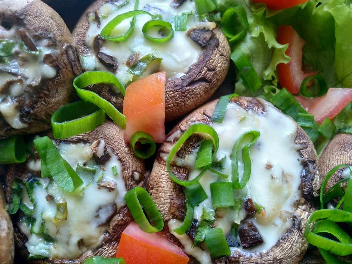 Дістаємо наші фаршировані шампіньйони з духовки, посипаємо зеленню і подаємо до столу.