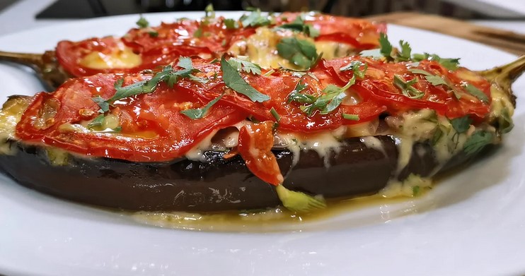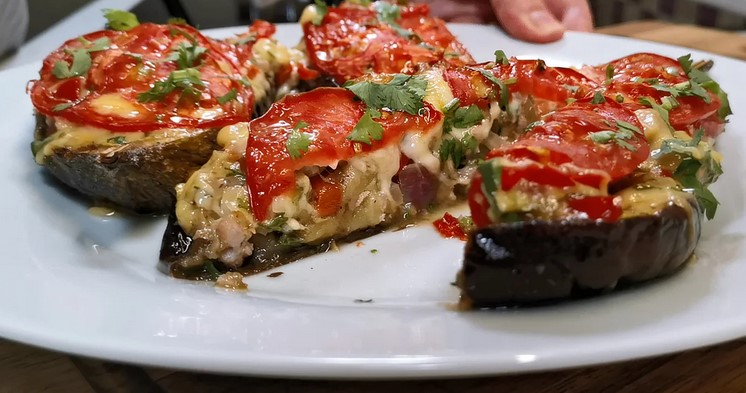 Фаршировані баклажани готові. Можна посипати з свіжою зеленню їх терміново подавати до столу, поки не охолов сир.
