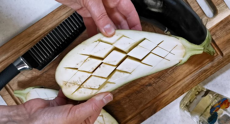 Баклажани розрізати навпіл уздовж і зробити в м’якоті глибокі хрестоподібні надрізи. Самі баклажани для цього рецепта краще взяти великі і товсті.