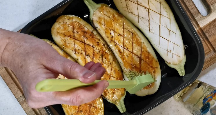 Змастити цією ароматною олією баклажани, укладені в форму. Олія має піти вся. Переживати, що її занадто багато не варто. Баклажани, як відомо, дуже її “люблять” і від цього стануть тільки смачнішими і соковитішими.