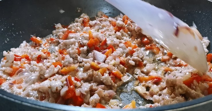 На олії обсмажити дрібно нарізану ріпчасту цибулю, викласти до неї будь-який фарш (в рецепті м’ясний), обсмажити до зміни кольору і додати болгарський перець, нарізаний дрібними кубиками. Посолити і поперчити за смаком, за бажанням додати будь-які спеції (в рецепті зіра) і потримати на вогні ще трохи, поки не випарується зайва рідина. Начинка не повинна бути занадто вологою.