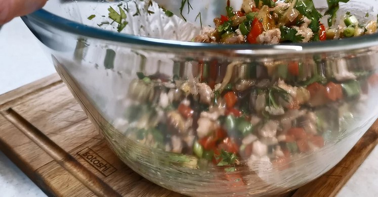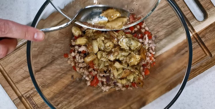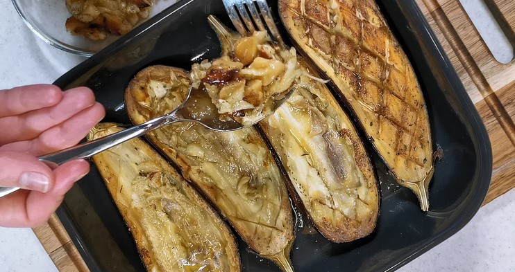 Далі перекласти начинку в глибоку ємність. А тим часом дістати запечені баклажани з духовки і витягти з них м’якоть звичайною ложкою. Якщо баклажани добре і правильно пропеклися, то виймається вона дуже легко, буквально одним рухом.