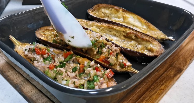 Фаршировані баклажани, приготовані цим методом, виходять значно смачніші, а часу йде стільки ж, як і на найвідоміший класичний рецепт. Баклажани з начинкою готуються, як зазвичай, в духовці, але тільки запікаються спеціальним чином з надрізами. Начинку можна робити будь-яку. Цей рецепт з фаршем.