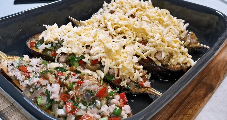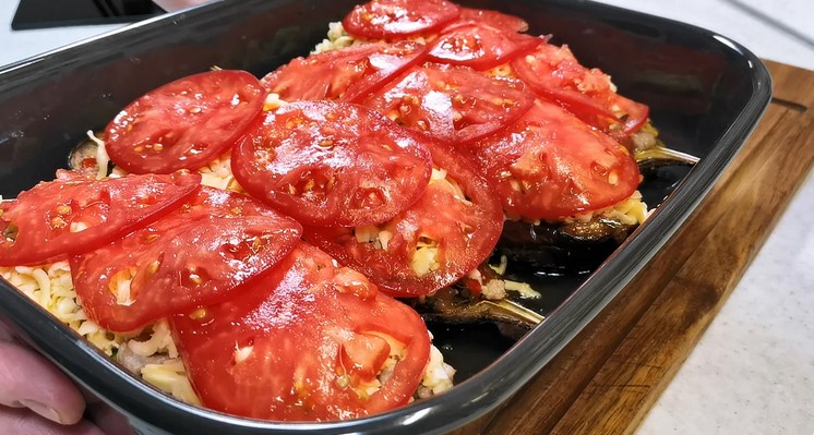 Поставити форму в заздалегідь розігріту духовку і запікати 30 хвилин при температурі 230 градусів. Це перший етап запікання. Буде і другий. А поки баклажани запікаються можна підготувати начинку.