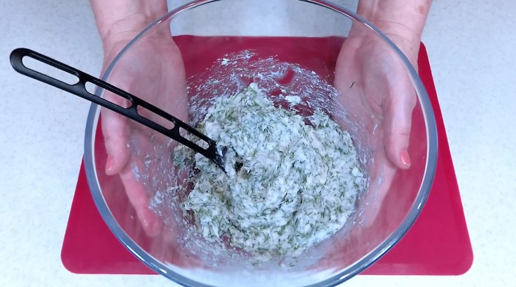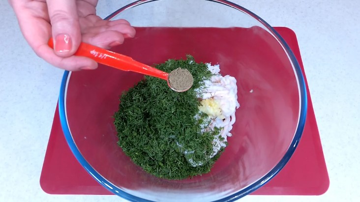 Додати у фарш із сала кріп та часник. Кріп дрібно нарізати, а часник пропустити через прес.