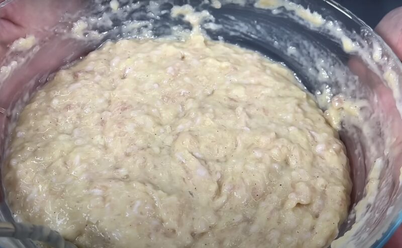 Натираємо на дрібній тертці цибулю та часник, зливаємо зайву рідину. Викладаємо цибулю у фарш разом з яйцями, сметаною та крохмалем. Солимо фарш, посипаємо чорним меленим перцем та содою, ретельно перемішуємо.