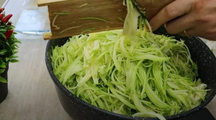 1. Кабачки вимийте і натріть на тертці корейською довгою соломкою. Це робиться легко і досить швидко, так як овочі м’які.