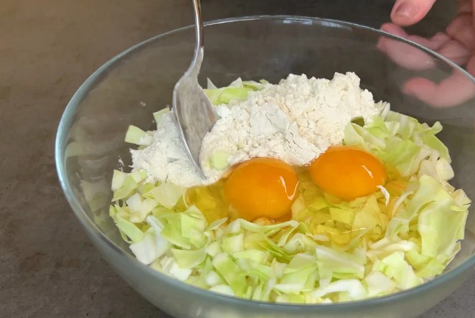 Виливаємо рідку основу в капусту із зеленню та добре вимішуємо до однорідності.