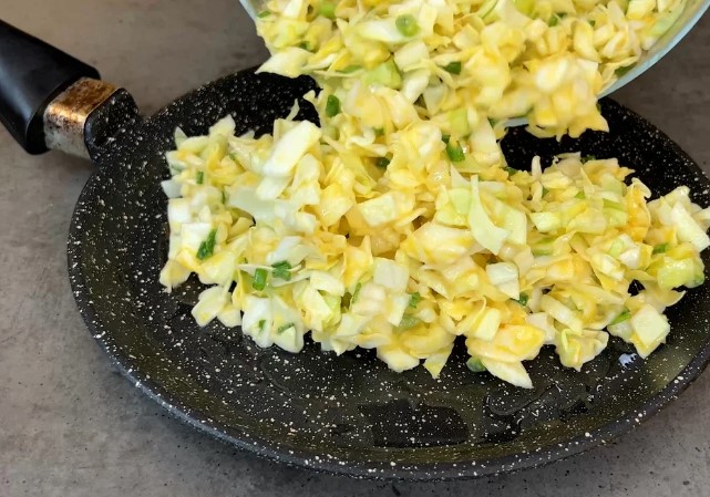 У сковороду вливаємо трохи олії, нагріваємо і викладаємо нашу капустяну масу.