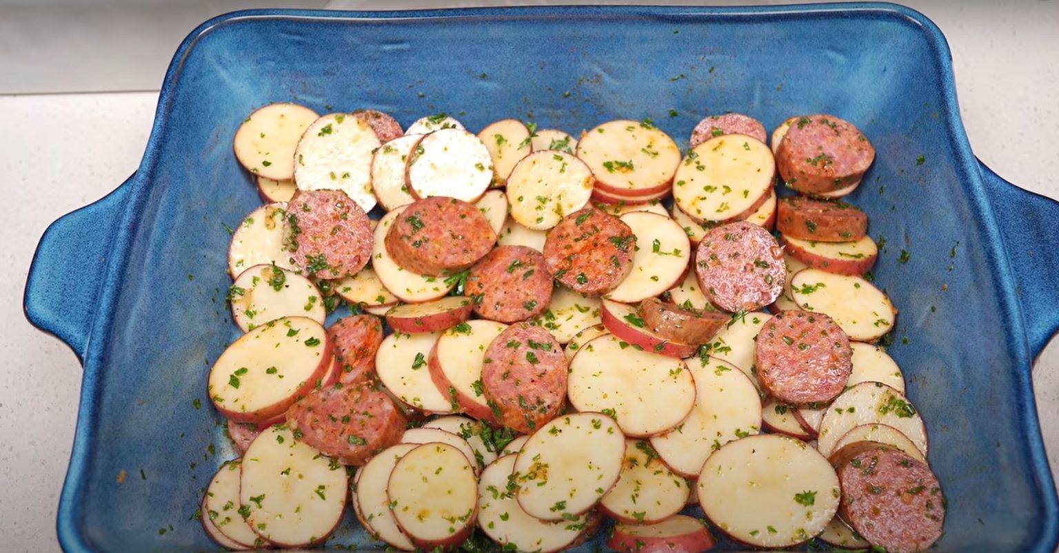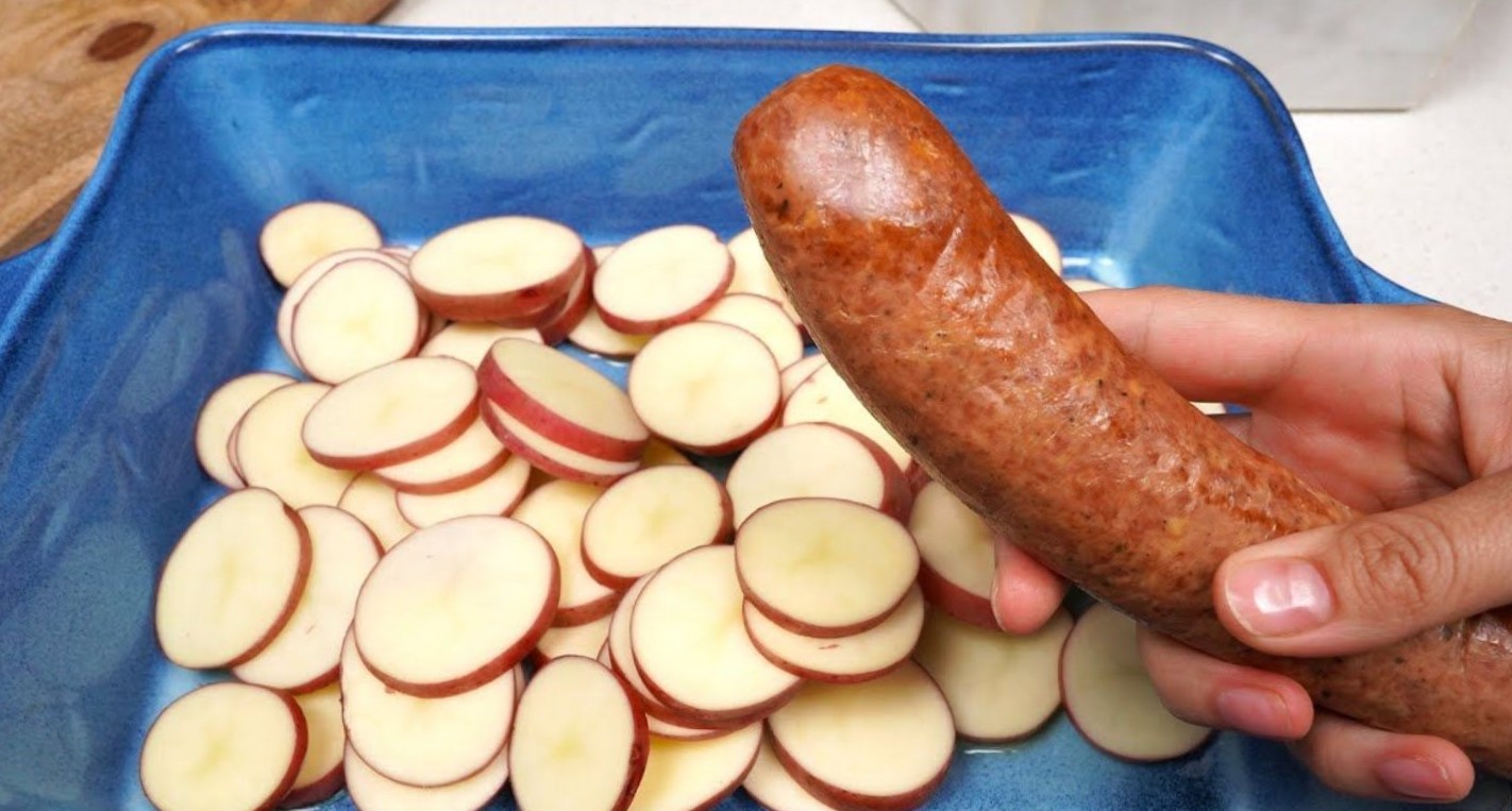 Ковбасу або шинку, копчене м’ясо або відварене, ріжемо шматочками і змішуємо з картоплею у формі.