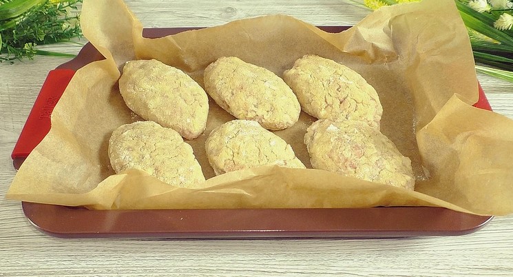 Обвалюємо у борошні або сухарях і відправляємо на деко. Деко я завжди застеляю папером для випічки.