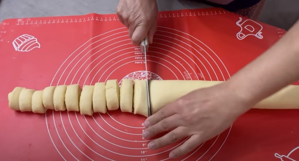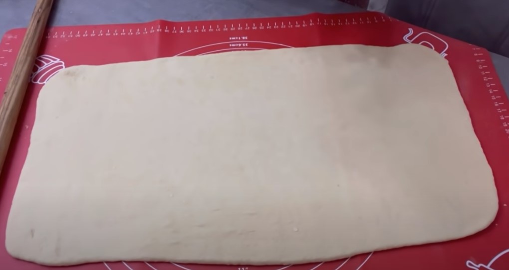 Розкочуємо тонкий пласт тіста і змащуємо розм’якшеним вершковим маслом, згортаємо в рулет, защипуємо краї та трохи обминаємо рулет і розкочуємо кілька разів.
