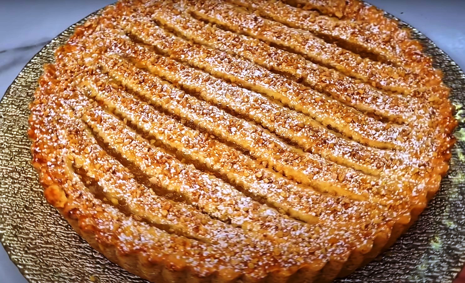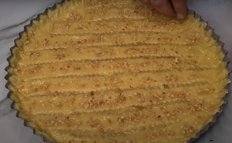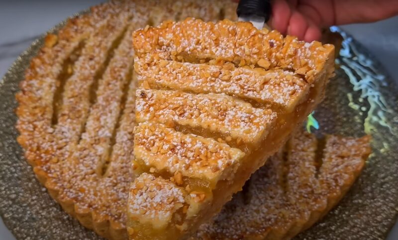 Забираємо надлишки тіста з країв пирога. Змащуємо верхівку тіста сумішшю яйця та столової ложки молока. Можна посипати верхівку також подрібненим мигдалем чи арахісом.
