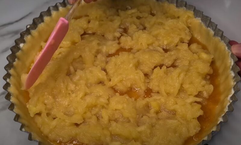 Покриваємо тістом дно та стінки форми. Для приготування начинки видаляємо з яблук насіннєві коробочки та шкірку. Натираємо яблука на великих різцях терки, змішуємо з лимонним соком, цукром та вершковим маслом.