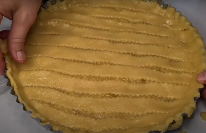 На круглій верхівці із тіста робимо невеликі надрізи. Щоб перенести тісто на пиріг, розгортати його потрібно на пергаменті. Переносимо тісто на верхівку пирога і акуратно розподіляємо по начинці та краях тіста основи.