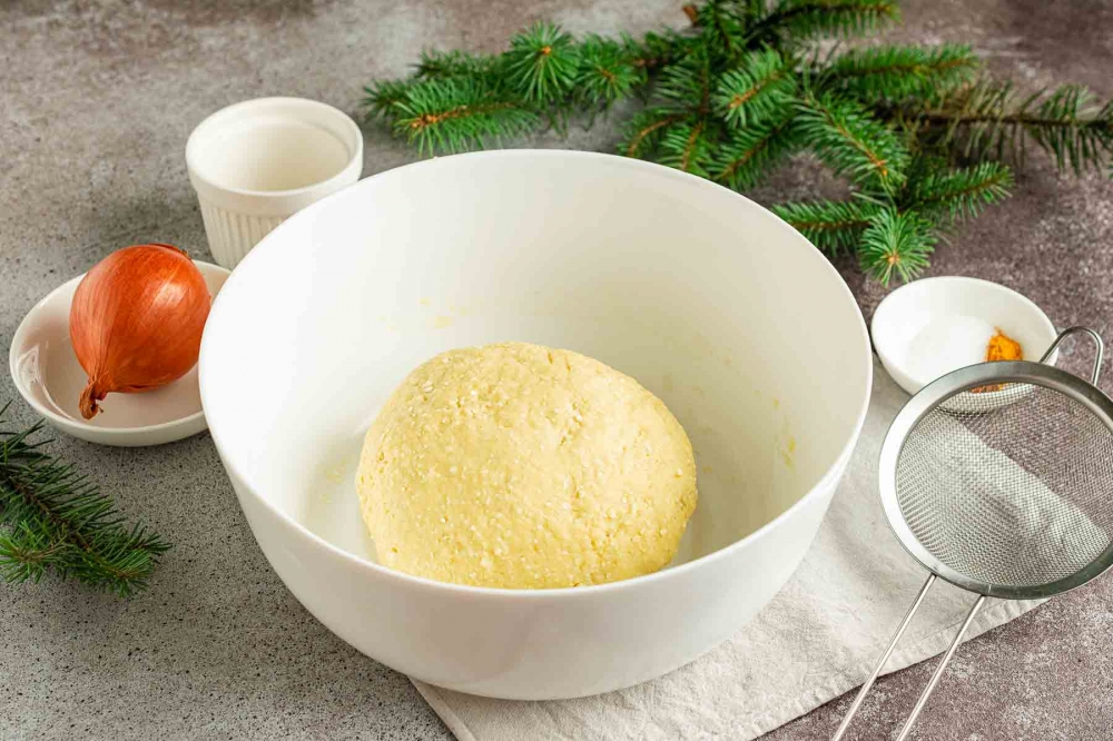 Замісіть м’яке еластичне тісто. Накрийте посуд плівкою або сухим рушником, залиште на 10 хвилин.