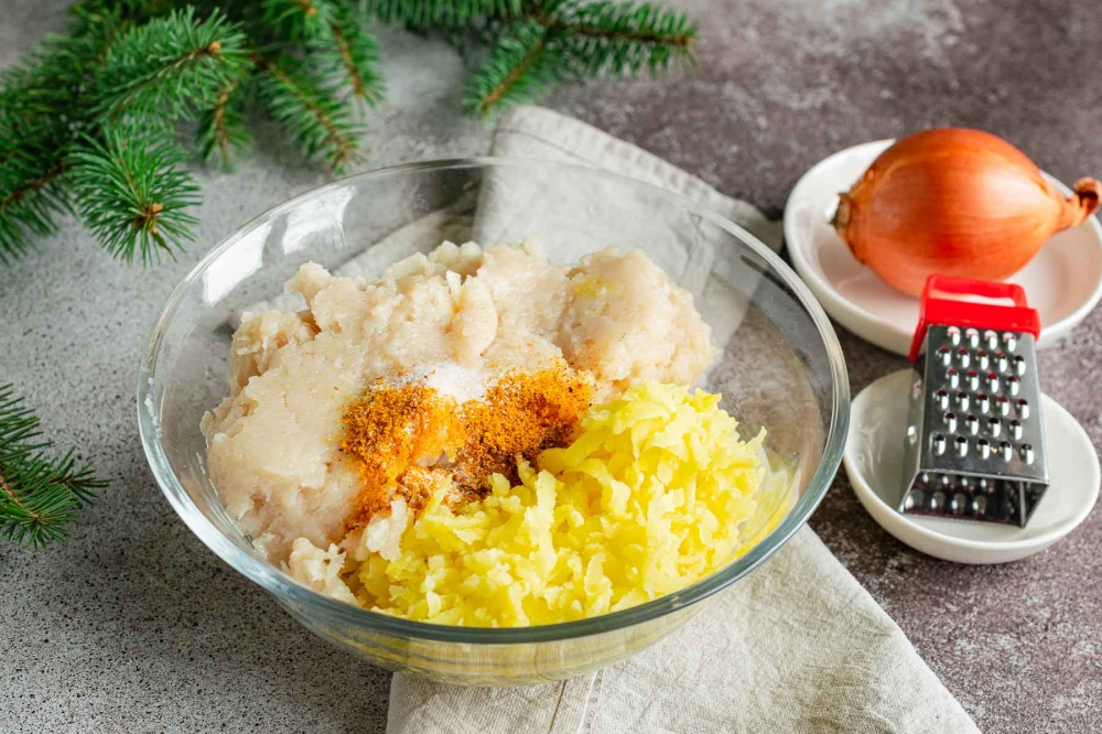 Приготуйте начинку. М’ясо помийте, зачистіть від жиру та плівок, наріжте на невеликі шматочки. Подрібніть м’ясо та одну головку цибулі в однорідний фарш за допомогою м’ясорубки або блендера. Картоплю помийте, очистіть від шкірки, відваріть до готовності у підсоленій воді. Картоплю, що остигла до кімнатної температури, подрібніть на тертці з великими зубцями. Змішайте фарш з тертою картоплею, додайте сіль та спеції за смаком. Перемішайте начинку до однорідної суміші.