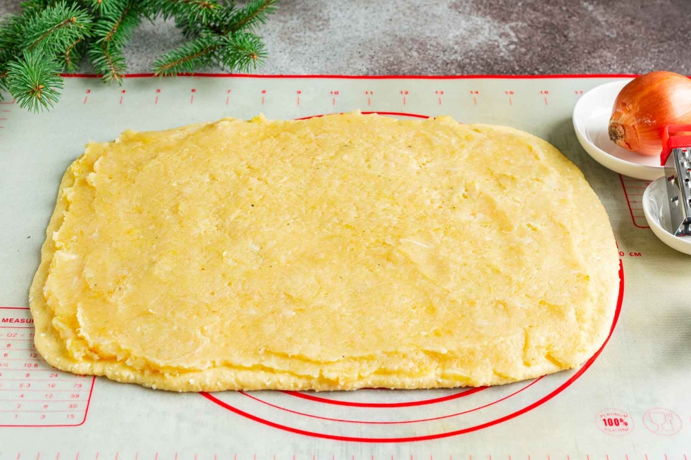 Готове тісто розкотіть у прямокутний пласт товщиною 3-4 мм.