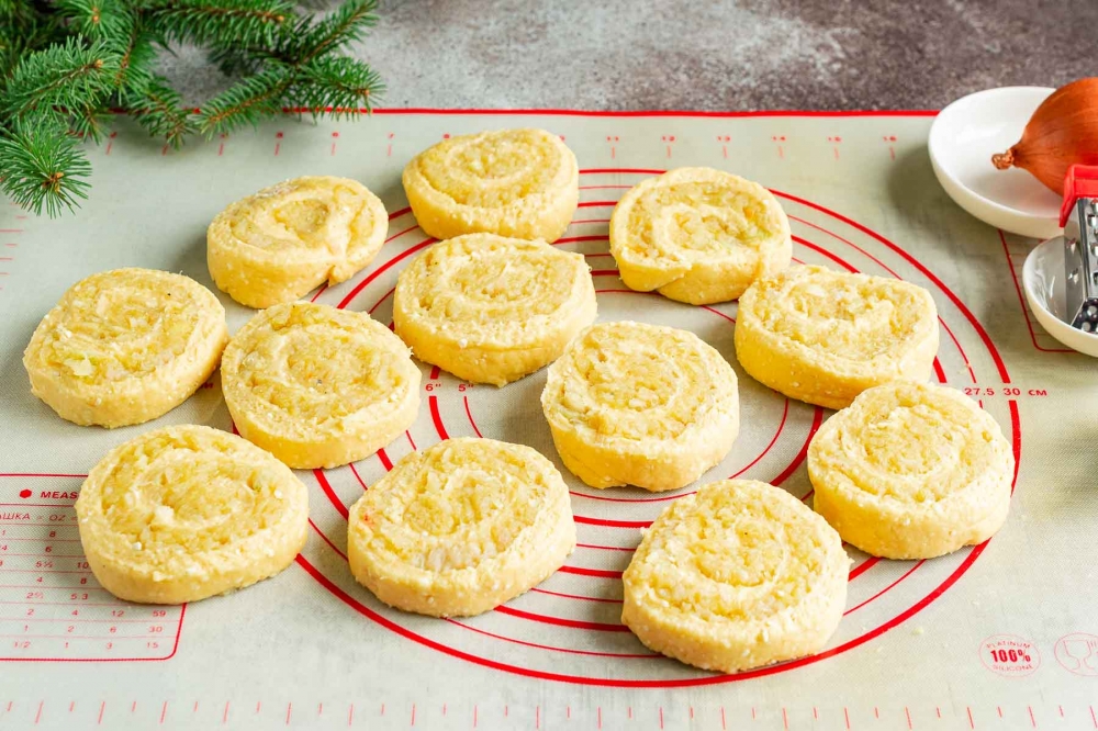 Згорніть заготовку в рулет до вільного від начинки краю. Гострим ножем наріжте рулет на порції шириною 2-3 см.