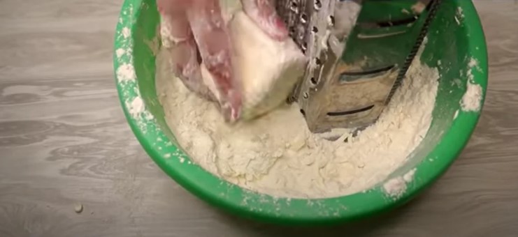Відміряємо борошно, беремо вершкове масло (з морозильної камери) і натираємо на грубій терці, намагаємося робити це швидко (трохи натерли перемішали з борошном і так все масло).