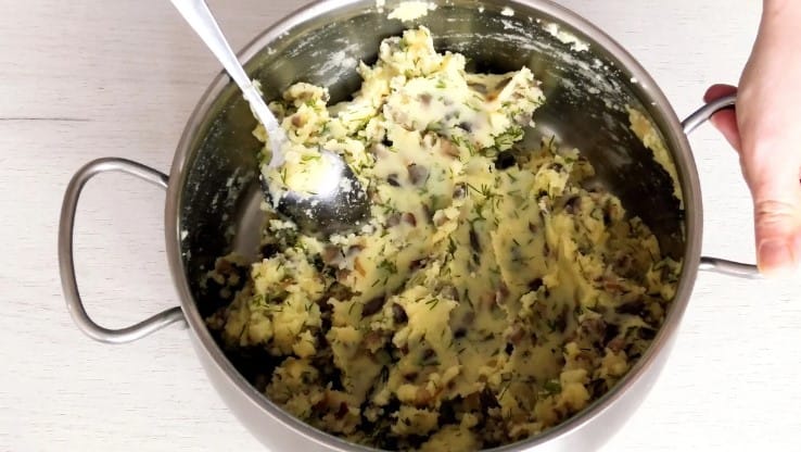 6. Викласти гриби з цибулею до картоплі, також додати кріп, перемішати. Посолити і поперчити за смаком.