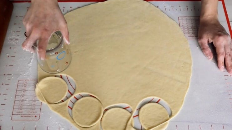 10. Відпочиле тісто розділити на дві частини, кожну розкачати завтовшки 3 мм і вирізати кола діаметром близько 7-8 см.
