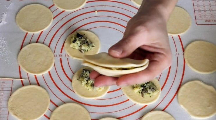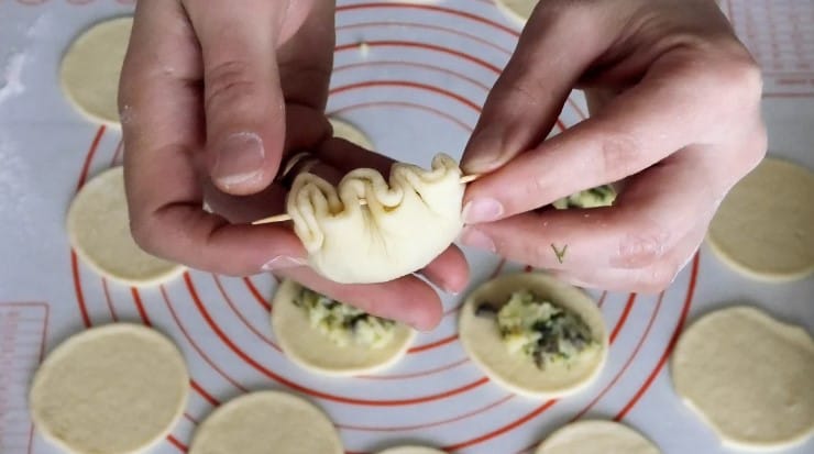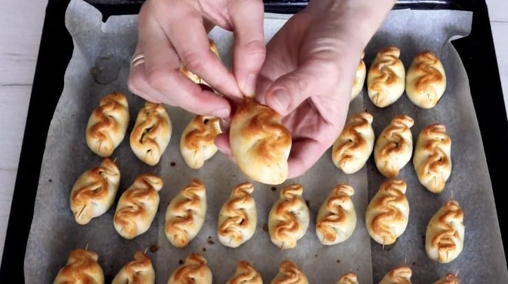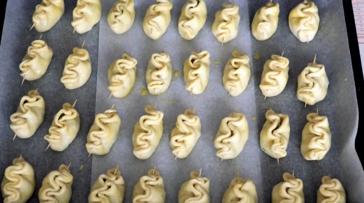 12. І сформувати пиріжок як показано на фото. Краї пиріжків не защипуємо, а наколюємо на зубочистку так, як ніби шиємо голкою.