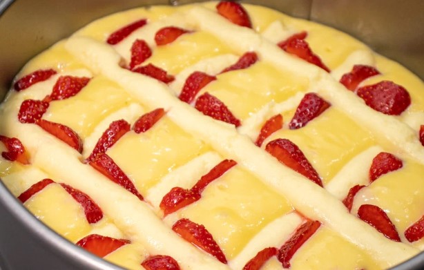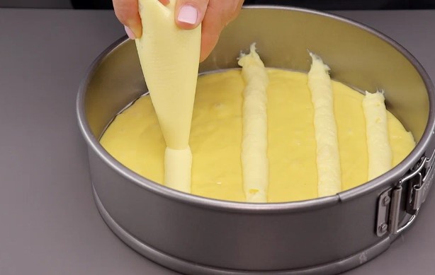 Беремо круглу форму із пергаментом. На дно рівномірно укладаємо тісто. Заварний крем поміщаємо в мішок кондитерський і красиво у формі решітки видавлюємо на майбутній пиріг.