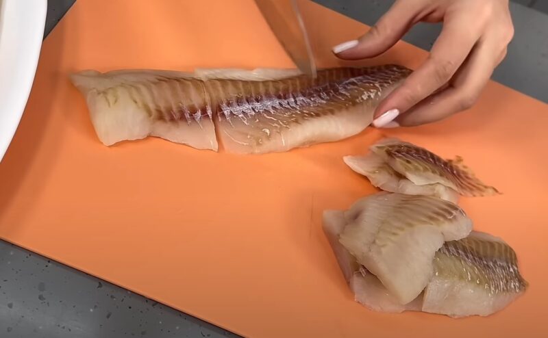 Видаляємо у риби голову, хвіст і плавці, а також хребет і кишки, ділимо мінтай на невеликі шматочки філе.