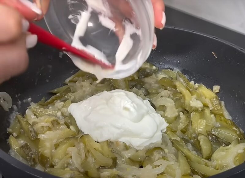 Обсмажуємо на олії цибулю, до цибулі додаємо також огірки. Вливаємо до цибулі та огірків 200 мл окропу і залишаємо тушити на 10 хвилин під кришкою.