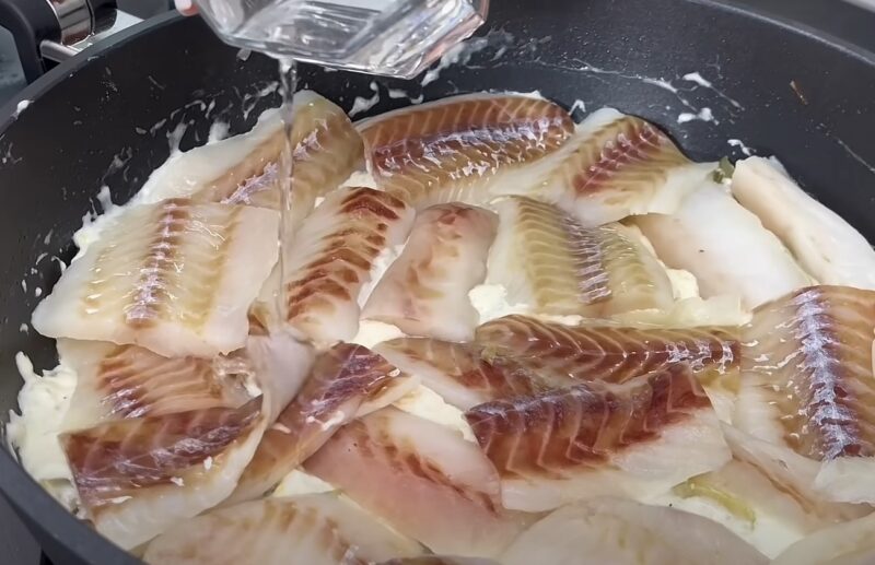 Викладаємо на соус та овочі рибу, вливаємо на неї 40 мл води, теж злегка підсолюємо.