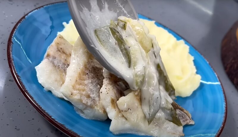 Подавати мінтай у соусі можна з картопляним пюре та кропом. Але також до страви підходять і крупи.