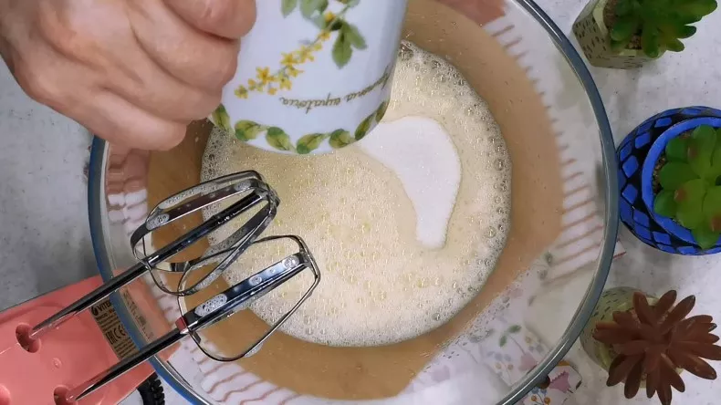 Потім всипаємо звичайний та ванільний цукор. Знову збиваємо 1 хвилину.