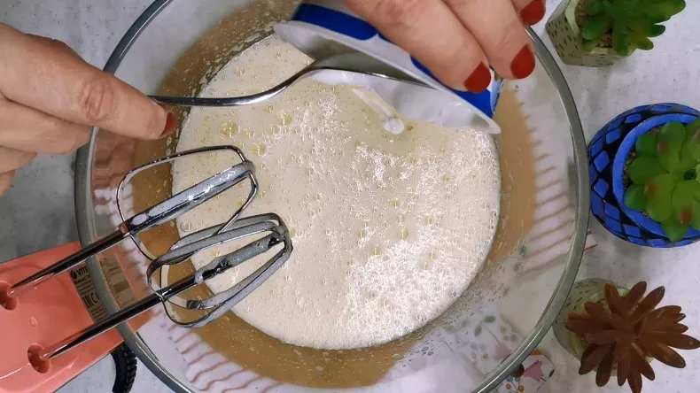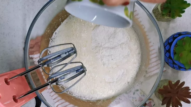 Всипаємо борошно. Його так мало, що навіть не віриться. Але це вірно. Всипаємо і знову збиваємо 30 секунд. І ніякого розпушувача!