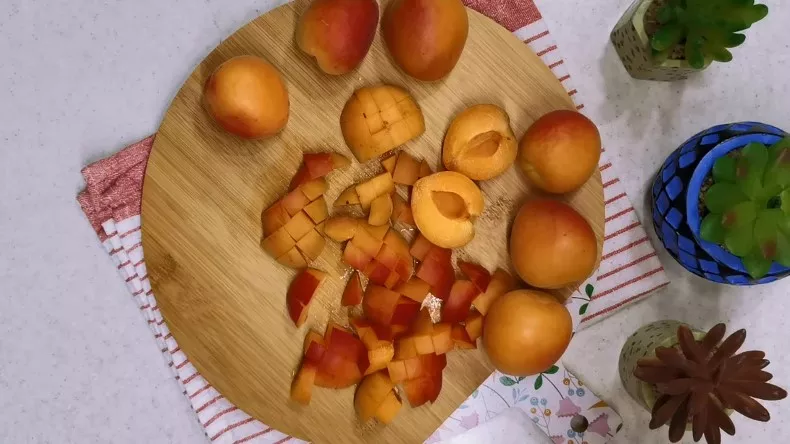 Далі начинка. Ріжемо абрикоси на невеликі шматочки.